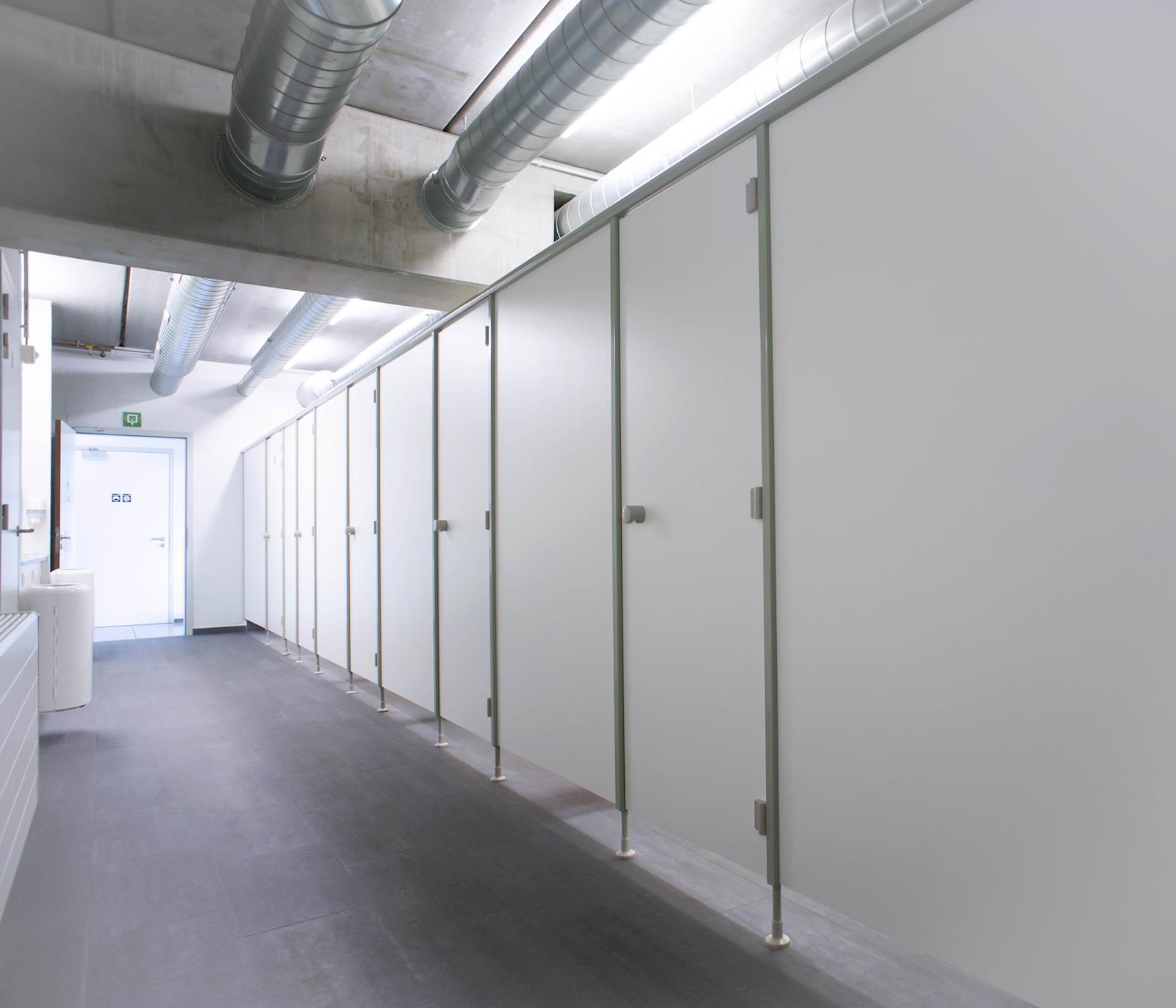 Comme vous vous en doutez, ce type de cabine est la plus robuste de notre gamme. Le profil en aluminium avec pied support intégré en aluminium sert de montant de porte. On obtient ainsi une cabine ultra stable et qui résiste au vandalisme. Les pieds supports sont très rapprochés de l’ouverture de la porte, ce qui permet de prévoir des portes plus larges, si besoin était. Pour des cabines plus spacieuses, le choix de ce type est recommandé de par sa grande stabilité.