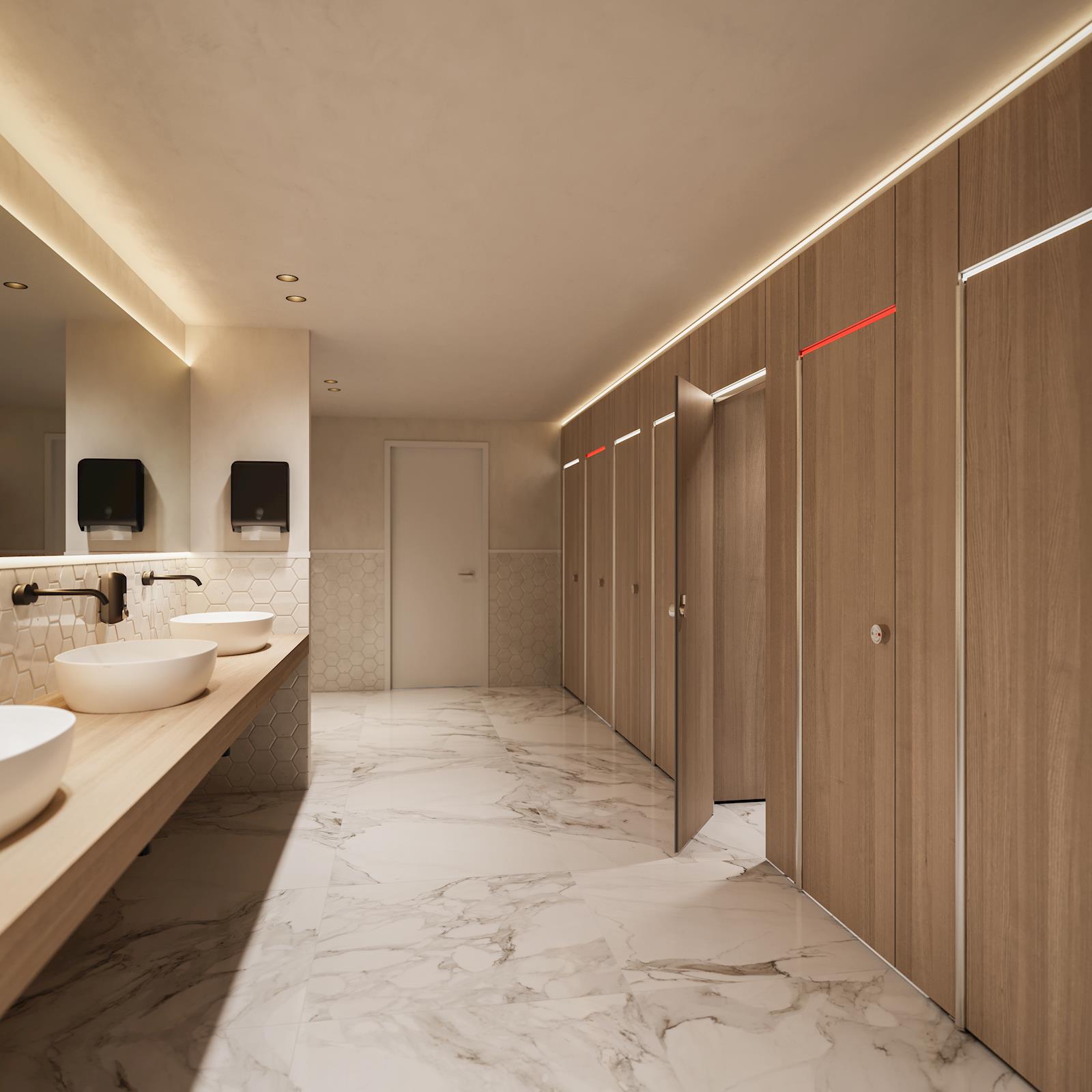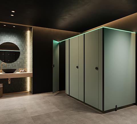 AFKOR type 13.smartline se compose de parois en HPL de 13 mm fixées à un profil supérieur arrière en aluminium, supportant des pieds rectangulaires en aluminium. Ce concept de cabine existe en deux variantes : la version flottante "avec pieds design encastrés" et la version sol/plafond "intimité maximale". Les deux variantes conservent la possibilité d'un entretien optimal des espaces sanitaires. Les portes sont pourvues d’une paumelle sécurisée sur toute la hauteur de la porte, pourvue d'un mécanisme d'amortissement intégré unique en son genre qui empêche de s'y coincer les doigts. Lors de la fermeture de la porte, la dernière phase est amortie pour que la porte se ferme en douceur, contribuant au confort des utilisateurs. La porte est pourvue d’un bouton de porte design fixe et de verrou en aluminium.
