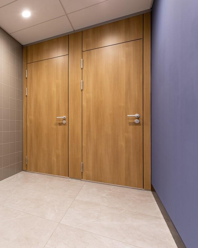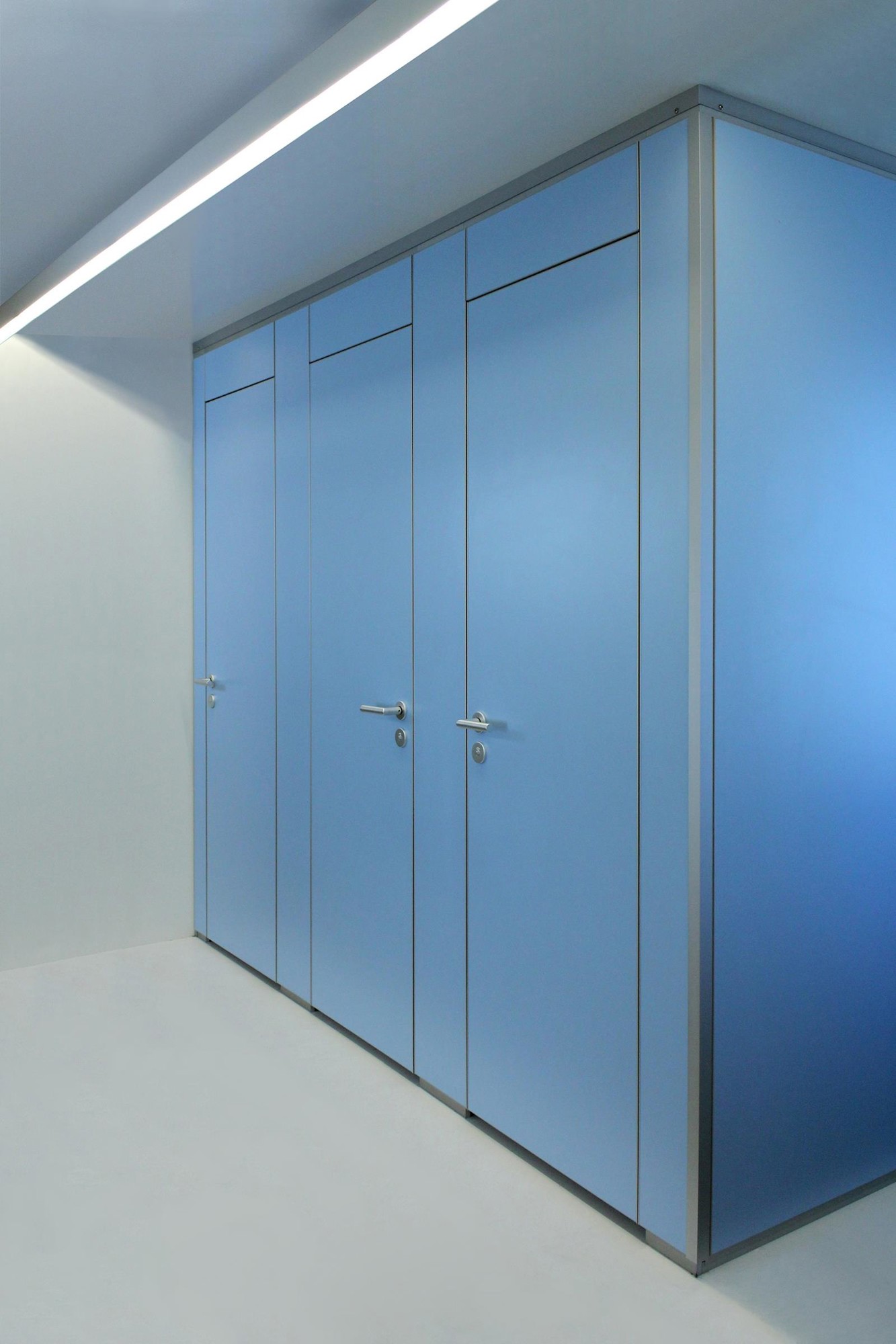 La feuillure des portes est pourvue d'un amortisseur silencieux. Les portes comportent des verrous avec indicateur, des poignées anodisées et des rosaces ainsi que des paumelles en aluminium à fermeture automatique. Les pieds en aluminium sont recouverts d'un cache. Existent aussi en acier inoxydable. Le modèle NiUU est constitué de panneaux en particules de bois aggloméré avec une finition ABS et un profil vertical renforcé en aluminium.