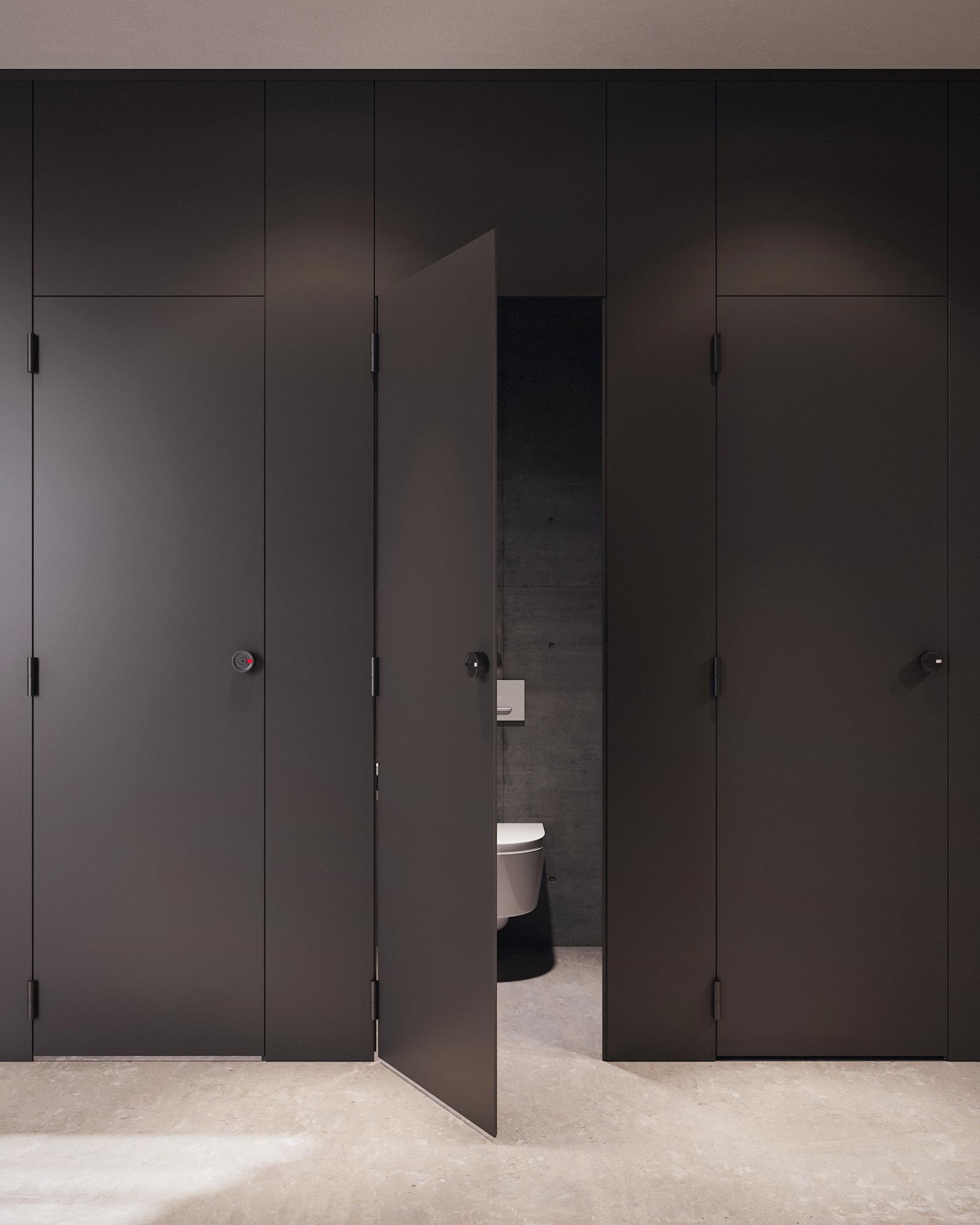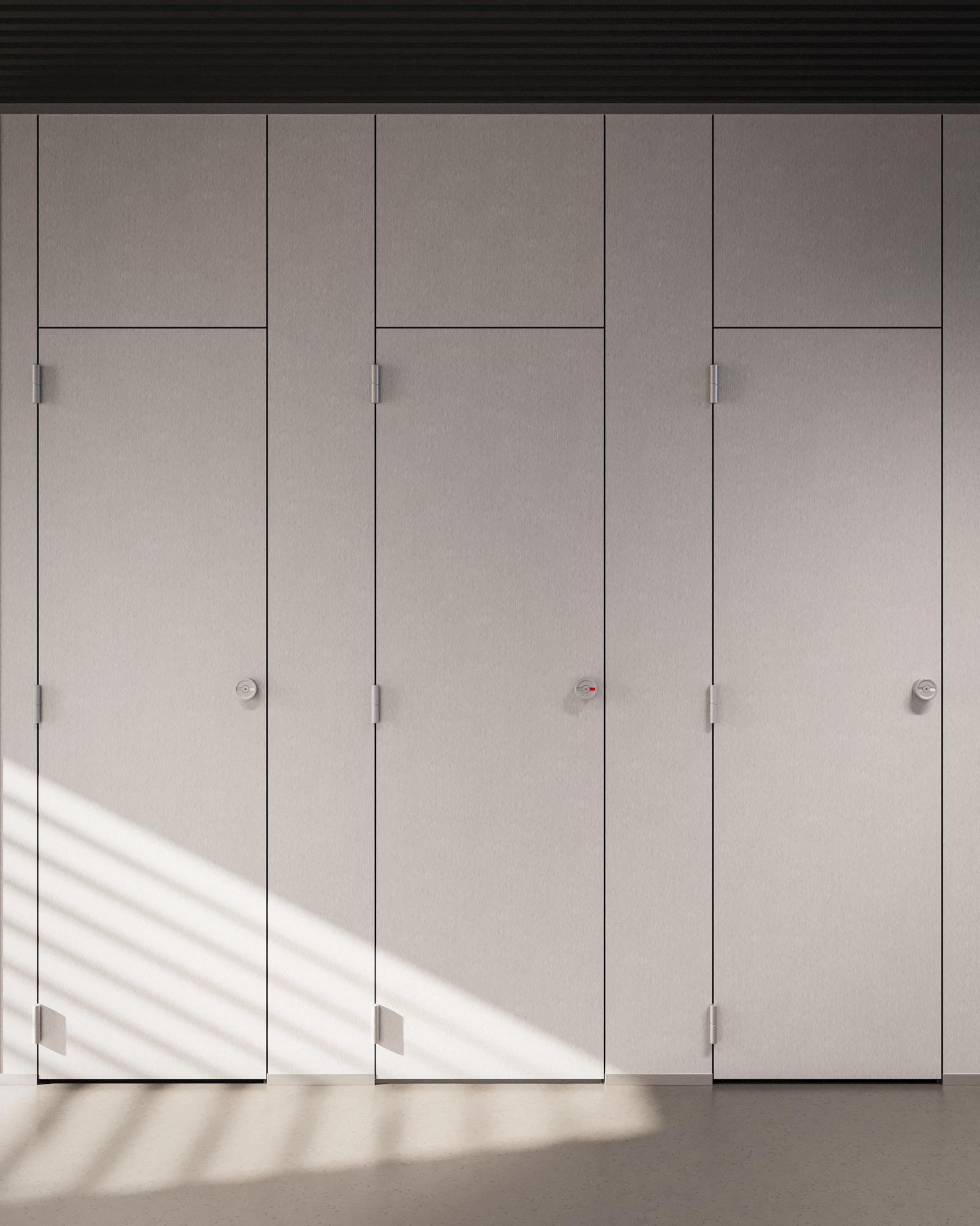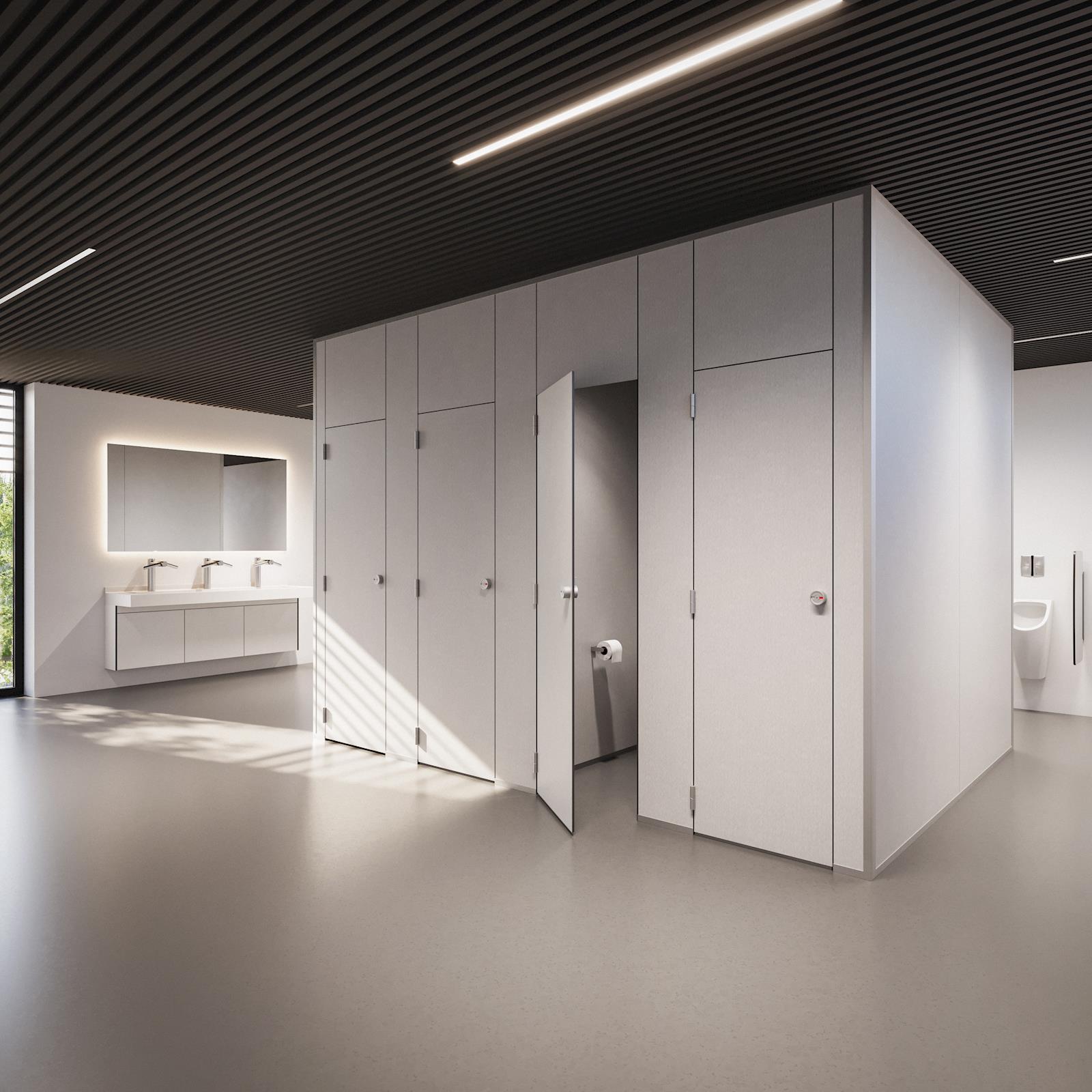 Avec le concept standard sol/plafond AFKOR type 13.sci-vp, nous offrons une solution où une intimité maximale est souhaitée. Le concept consiste en des cloisons HPL de 13 mm, avec les portes dans le même plan que la paroi frontale. La paroi frontale et les cloisons sont fermées jusqu'au sol. Les vantaux des portes sont équipés de trois charnières verticales à fermeture automatique, disponibles en nylon, en aluminium ou en acier inoxydable. (variante : AFKOR type 13.scs-vp)