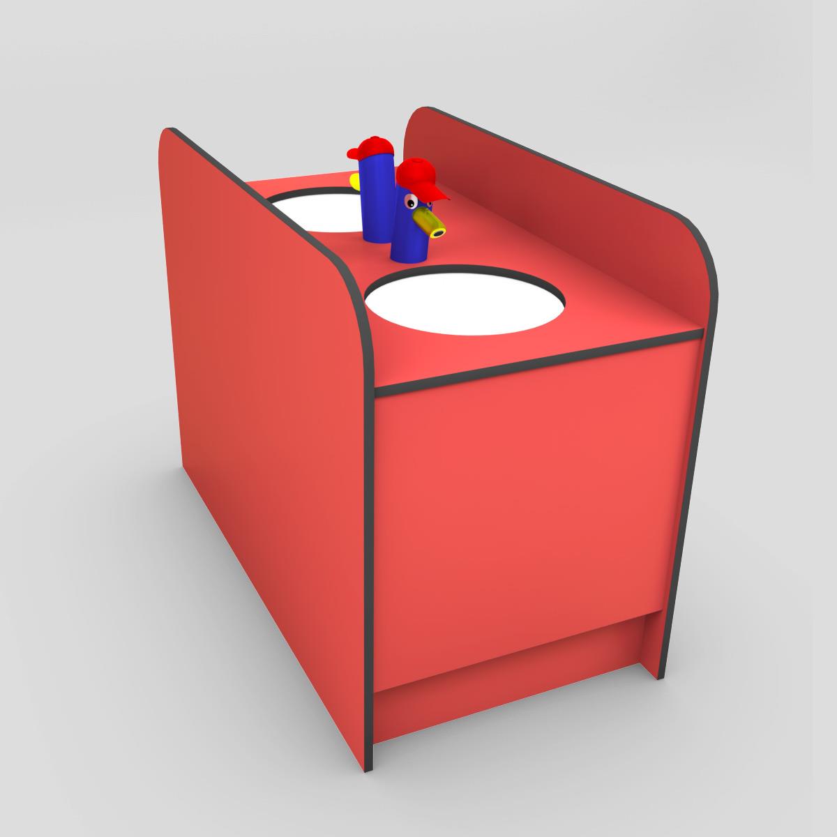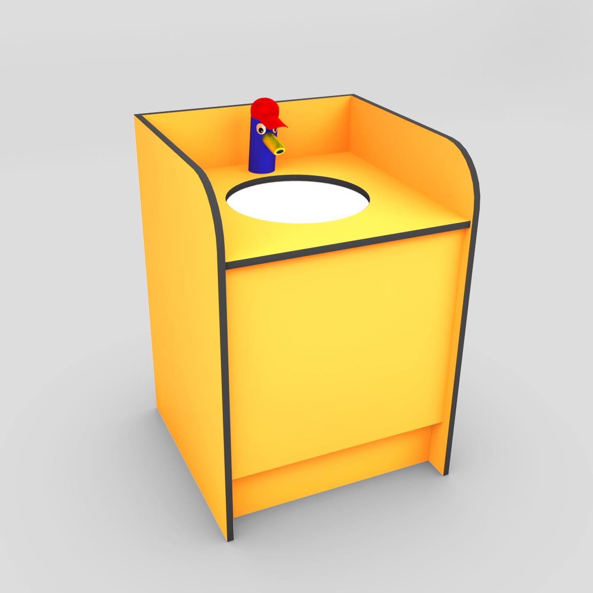 Le meuble est équipé d'un lavabo pour enfant avec un robinet adapté pour enfant, y compris les accessoires pour le raccordement à l'égouttage. Pour les panneaux HPL, vous avez le choix entre 15 couleurs standard différentes. Une combinaison de différentes couleurs est possible sans supplément de prix. Une impression photo peut être appliquée en option sur les panneaux avant, latéraux et arrière.
