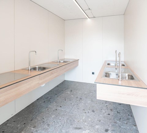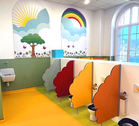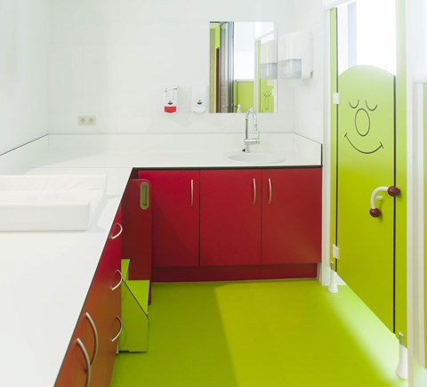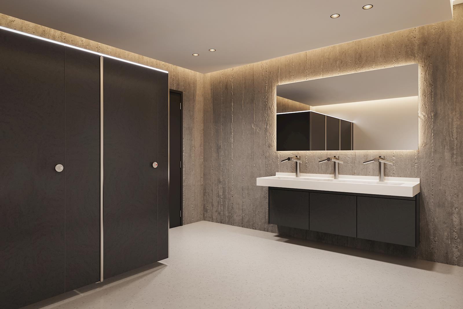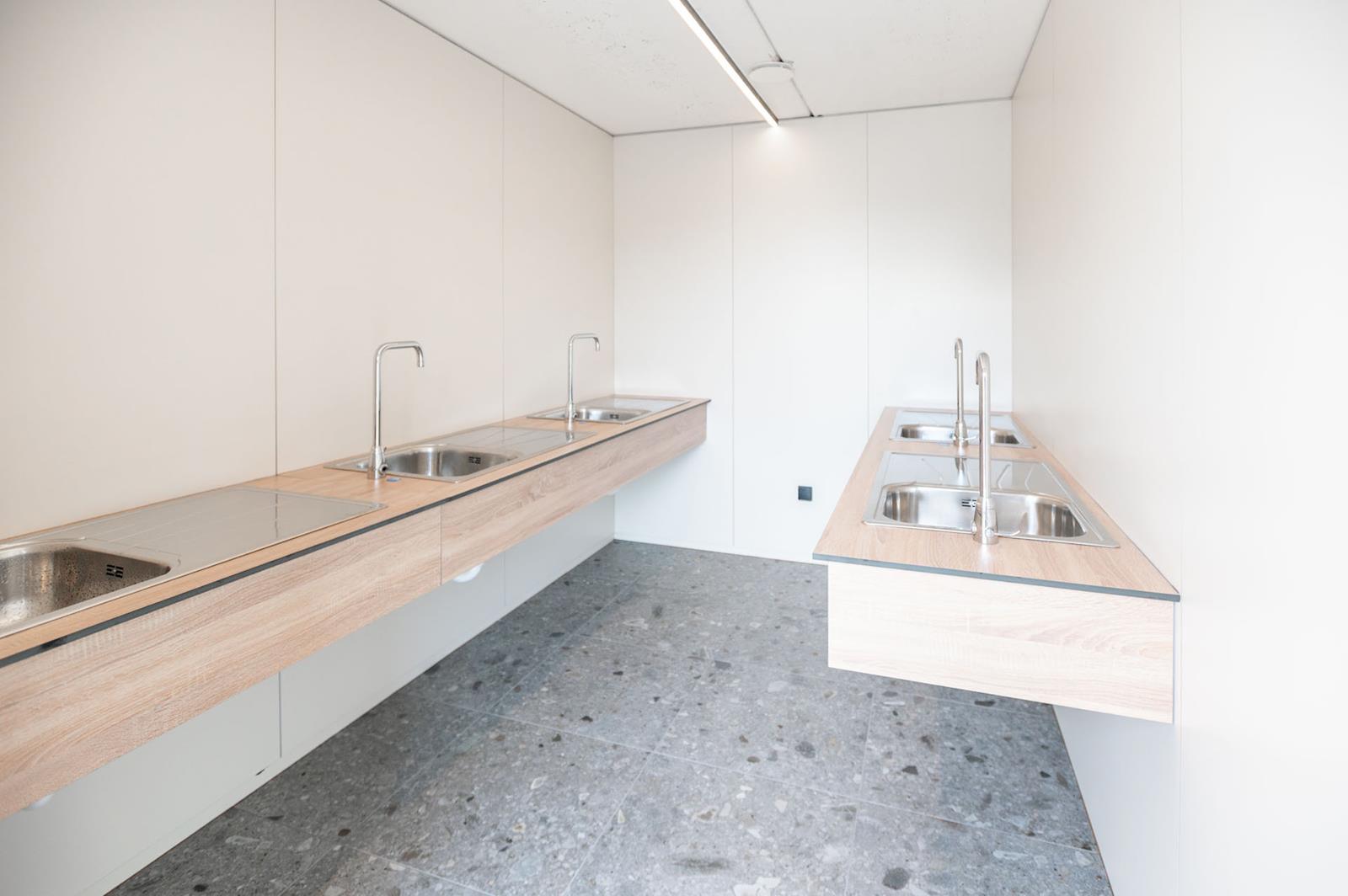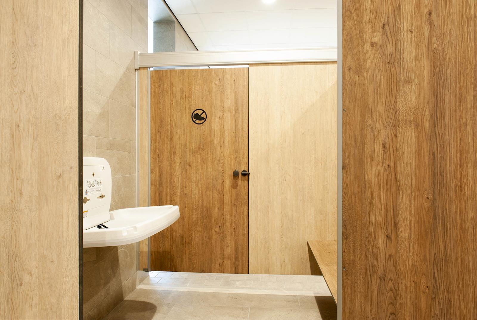 De wanden uit massieve kunststofplaten zijn zeer slijtvast, waterbestendig, antibacterieel en buitengewoon onderhoudsvriendelijk.