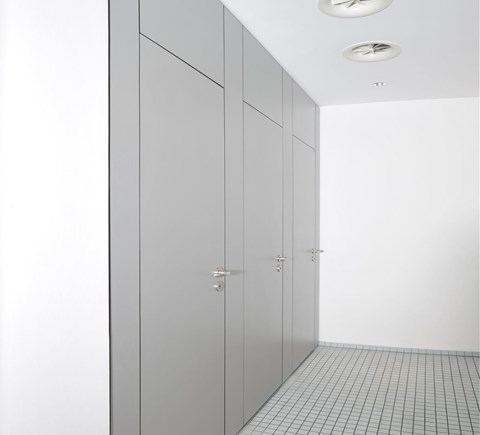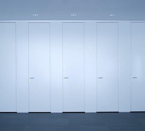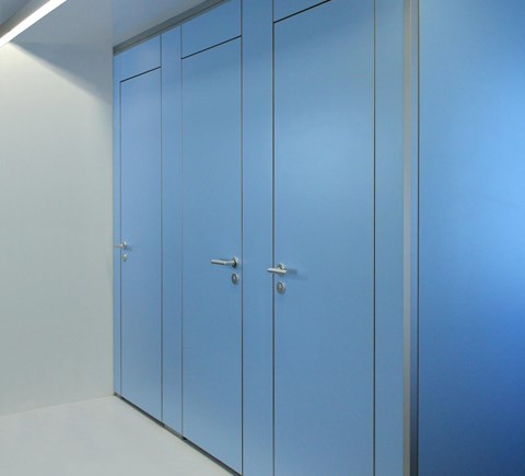 De deuraanslag wordt gemaakt d.m.v. sponningen met geluid-demping. De deuren worden voorzien van vrij-en bezetsloten met geanodiseerde deurkrukken en rozetten, alsmede aluminium zelfsluitende scharnieren. Variante in RVS.
